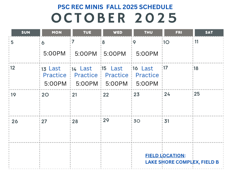 There are no make-up days for Rec Minis. Please check Facebook and the PSC website for all field closures. All field closures due to inclement weather will be announced by 4pm (weekdays) or 7am (weekends) on the PSC Website and PSC Facebook Page.