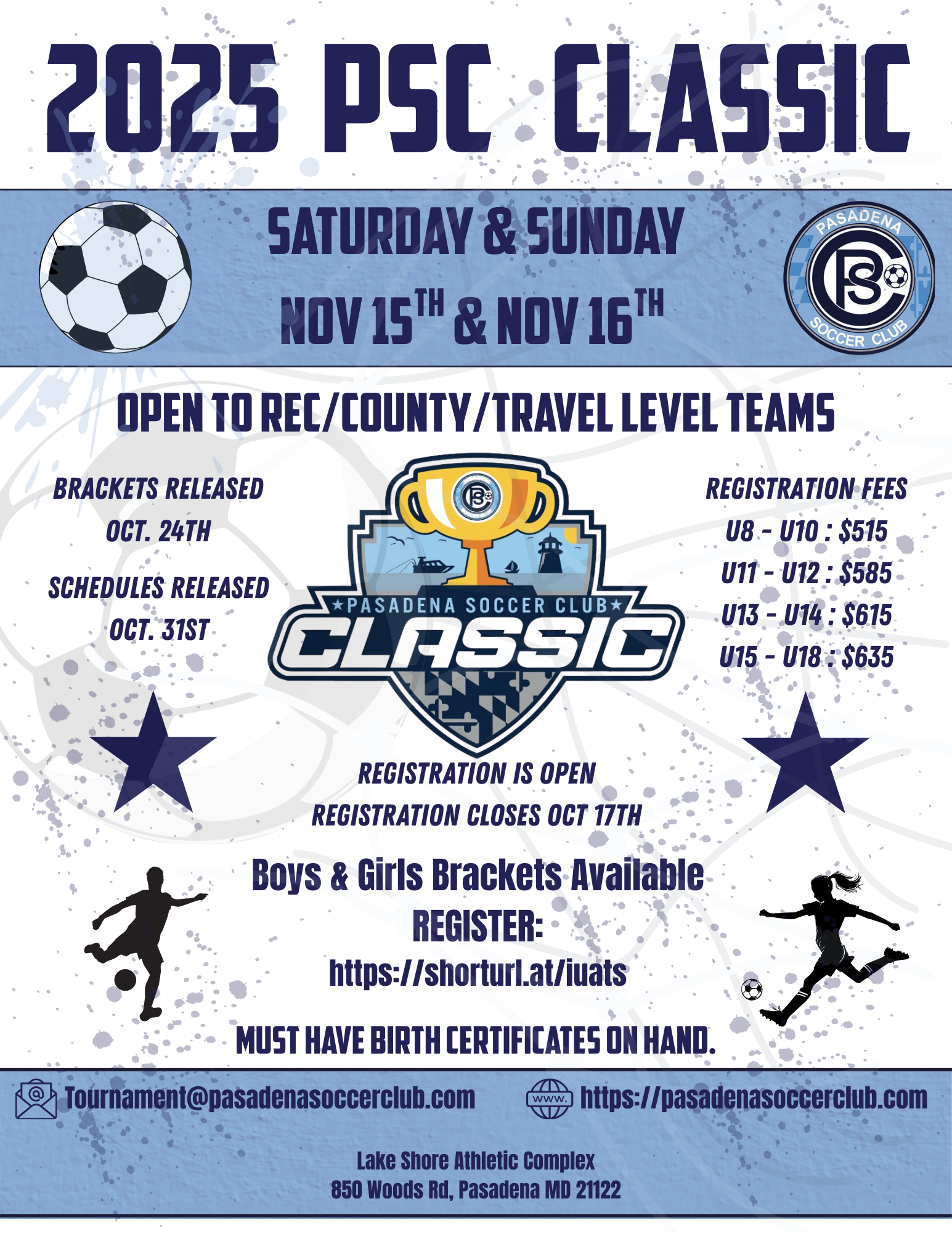 All boys/girls level of teams are welcome and the tournament covers U8 - U18! Rec/County/Travel are all welcome.